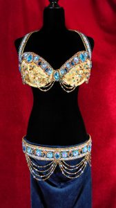Dripping with opulence, this pharaonic themed Belly Dance Bra/Belt set is powerfully elegant. This set is loaded with heavily beaded rhinestone medallions and rhinestone trim in the pharaonic colors of turquoise, bronze and gold.